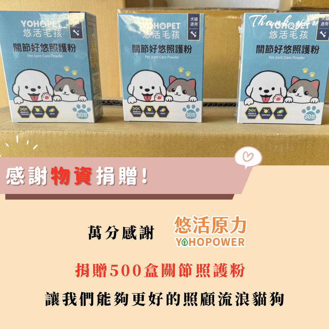誠摯感謝 悠原活力 捐贈 500 盒關節照護粉,讓我們能夠為更多流浪貓狗提供更好的照顧與保護。這份善心不僅幫助了需要關節照護的毛孩們,也為我們的行動帶來更多支持與力量。